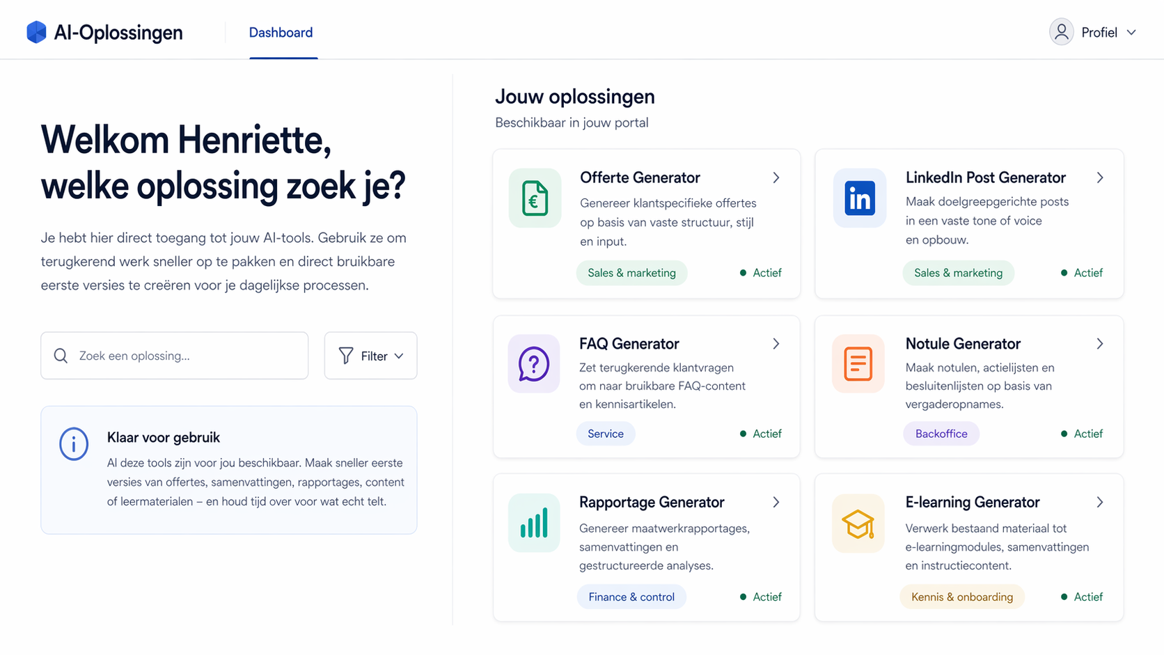 Krijg via onze toolomgeving toegang tot concrete AI-oplossingen voor tijdrovende processen binnen MKB-bedrijven.